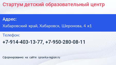 Стартум, детский образовательный центр по адресу Хабаровский край, Хабаровск, Шеронова, 4 к1 в дальнейшем Организация, размещена в следующих категориях: