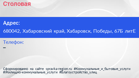 Столовая по адресу 680042, Хабаровский край, Хабаровск, Победы, 67Б литЕ в дальнейшем Организация, размещена в следующих категориях: