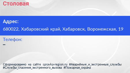 Столовая по адресу 680022, Хабаровский край, Хабаровск, Воронежская, 19 в дальнейшем Организация, размещена в следующих категориях: