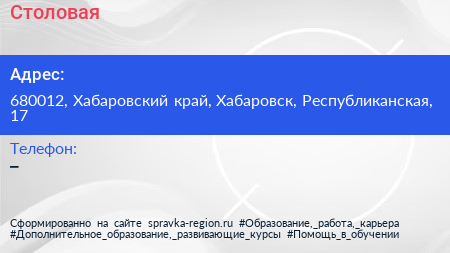 Столовая по адресу 680012, Хабаровский край, Хабаровск, Республиканская, 17 в дальнейшем Организация, размещена в следующих категориях: