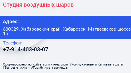 Студия воздушных шаров по адресу 680029, Хабаровский край, Хабаровск, Матвеевское шоссе, 1а в дальнейшем Организация, размещена в следующих категориях: