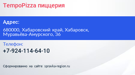 TempoPizza, пиццерия по адресу 680000, Хабаровский край, Хабаровск, Муравьёва-Амурского, 36 в дальнейшем Организация, размещена в следующих категориях: