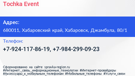 Tochka Event по адресу 680011, Хабаровский край, Хабаровск, Джамбула, 80/1 в дальнейшем Организация, размещена в следующих категориях: