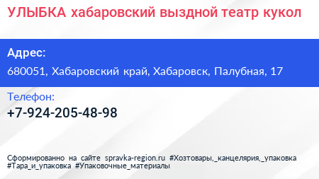 УЛЫБКА, хабаровский выздной театр кукол по адресу 680051, Хабаровский край, Хабаровск, Палубная, 17 в дальнейшем Организация, размещена в следующих категориях: