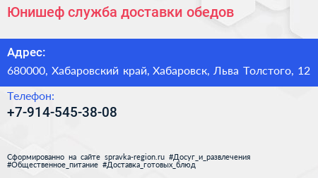 Юнишеф, служба доставки обедов по адресу 680000, Хабаровский край, Хабаровск, Льва Толстого, 12 в дальнейшем Организация, размещена в следующих категориях: