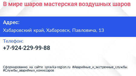 В мире шаров, мастерская воздушных шаров по адресу Хабаровский край, Хабаровск, Павловича, 13 в дальнейшем Организация, размещена в следующих категориях: