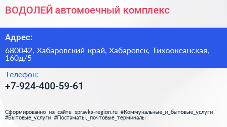 ВОДОЛЕЙ, автомоечный комплекс по адресу 680042, Хабаровский край, Хабаровск, Тихоокеанская, 160д/5 в дальнейшем Организация, размещена в следующих категориях: