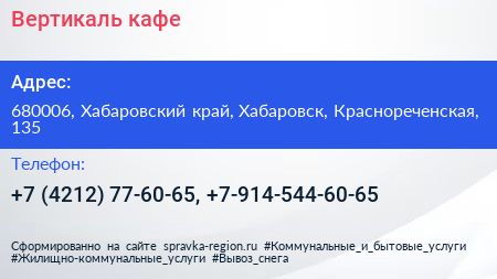 Вертикаль, кафе по адресу 680006, Хабаровский край, Хабаровск, Краснореченская, 135 в дальнейшем Организация, размещена в следующих категориях: