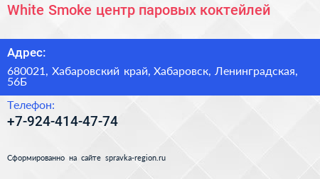 White Smoke, центр паровых коктейлей по адресу 680021, Хабаровский край, Хабаровск, Ленинградская, 56Б в дальнейшем Организация, размещена в следующих категориях: