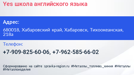 Yes, школа английского языка по адресу 680018, Хабаровский край, Хабаровск, Тихоокеанская, 218а в дальнейшем Организация, размещена в следующих категориях: