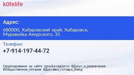 k0felife по адресу 680000, Хабаровский край, Хабаровск, Муравьёва-Амурского, 35 в дальнейшем Организация, размещена в следующих категориях: