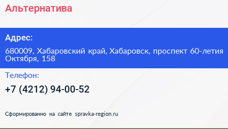 Альтернатива по адресу 680009, Хабаровский край, Хабаровск, проспект 60-летия Октября, 158 в дальнейшем Организация, размещена в следующих категориях: