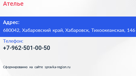 Ателье по адресу 680042, Хабаровский край, Хабаровск, Тихоокеанская, 146 в дальнейшем Организация, размещена в следующих категориях: