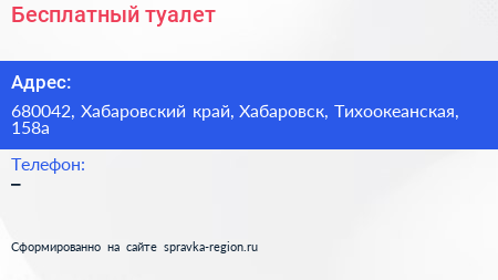Бесплатный туалет по адресу 680042, Хабаровский край, Хабаровск, Тихоокеанская, 158а в дальнейшем Организация, размещена в следующих категориях: