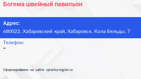 Богема, швейный павильон по адресу 680022, Хабаровский край, Хабаровск, Кола Бельды, 7 в дальнейшем Организация, размещена в следующих категориях: