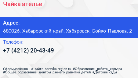 Чайка, ателье по адресу 680026, Хабаровский край, Хабаровск, Бойко-Павлова, 2 в дальнейшем Организация, размещена в следующих категориях:
