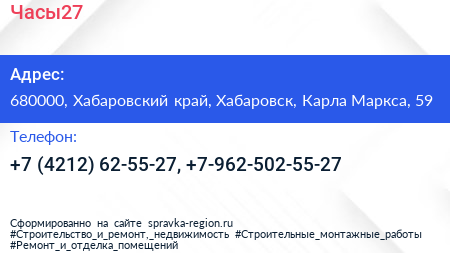 Часы27 по адресу 680000, Хабаровский край, Хабаровск, Карла Маркса, 59 в дальнейшем Организация, размещена в следующих категориях: