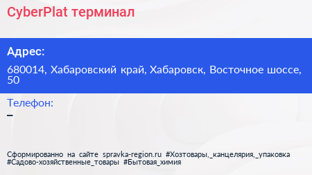 CyberPlat, терминал по адресу 680014, Хабаровский край, Хабаровск, Восточное шоссе, 50 в дальнейшем Организация, размещена в следующих категориях: