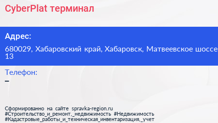 CyberPlat, терминал по адресу 680029, Хабаровский край, Хабаровск, Матвеевское шоссе, 13 в дальнейшем Организация, размещена в следующих категориях: