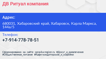 ДВ-Ритуал, компания по адресу 680031, Хабаровский край, Хабаровск, Карла Маркса, 144а/5 в дальнейшем Организация, размещена в следующих категориях: