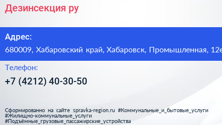 Дезинсекция.ру по адресу 680009, Хабаровский край, Хабаровск, Промышленная, 12е в дальнейшем Организация, размещена в следующих категориях: