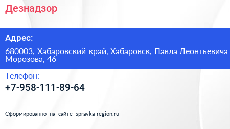 Дезнадзор по адресу 680003, Хабаровский край, Хабаровск, Павла Леонтьевича Морозова, 46 в дальнейшем Организация, размещена в следующих категориях: