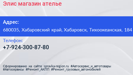 Элис, магазин-ателье по адресу 680035, Хабаровский край, Хабаровск, Тихоокеанская, 184 в дальнейшем Организация, размещена в следующих категориях: