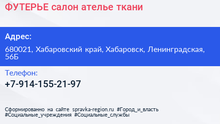 ФУТЕРЬЕ, салон-ателье ткани по адресу 680021, Хабаровский край, Хабаровск, Ленинградская, 56Б в дальнейшем Организация, размещена в следующих категориях: