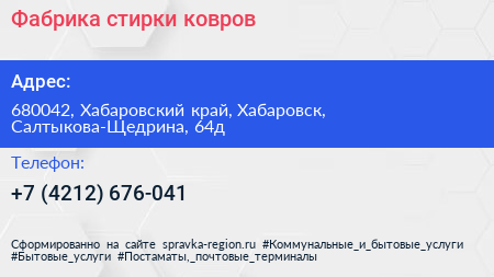 Фабрика стирки ковров по адресу 680042, Хабаровский край, Хабаровск, Салтыкова-Щедрина, 64д в дальнейшем Организация, размещена в следующих категориях: