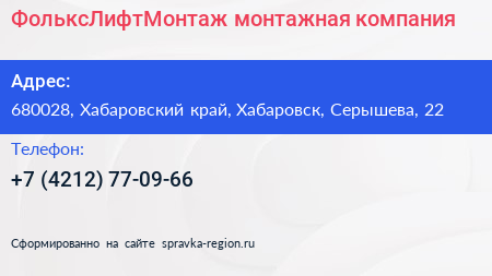 ФольксЛифтМонтаж, монтажная компания по адресу 680028, Хабаровский край, Хабаровск, Серышева, 22 в дальнейшем Организация, размещена в следующих категориях: