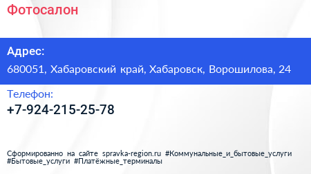 Фотосалон по адресу 680051, Хабаровский край, Хабаровск, Ворошилова, 24 в дальнейшем Организация, размещена в следующих категориях: