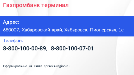 Газпромбанк, терминал по адресу 680007, Хабаровский край, Хабаровск, Пионерская, 1е в дальнейшем Организация, размещена в следующих категориях: