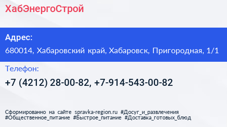 ХабЭнергоСтрой по адресу 680014, Хабаровский край, Хабаровск, Пригородная, 1/1 в дальнейшем Организация, размещена в следующих категориях: