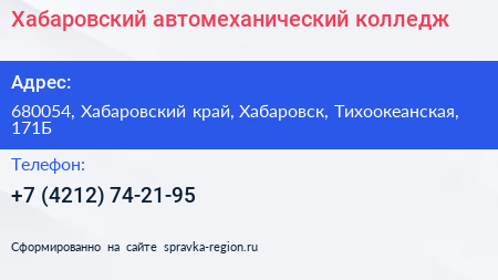 Хабаровский автомеханический колледж по адресу 680054, Хабаровский край, Хабаровск, Тихоокеанская, 171Б в дальнейшем Организация, размещена в следующих категориях: