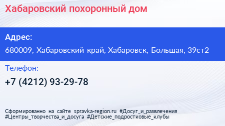 Хабаровский похоронный дом по адресу 680009, Хабаровский край, Хабаровск, Большая, 39ст2 в дальнейшем Организация, размещена в следующих категориях: