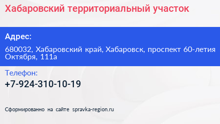 Хабаровский территориальный участок по адресу 680032, Хабаровский край, Хабаровск, проспект 60-летия Октября, 111а в дальнейшем Организация, размещена в следующих категориях: