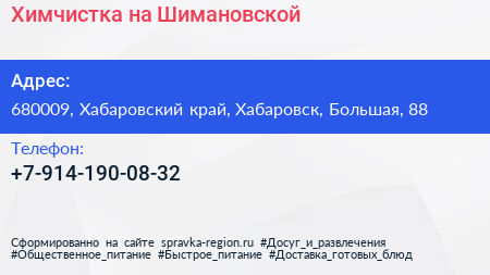 Химчистка на Шимановской по адресу 680009, Хабаровский край, Хабаровск, Большая, 88 в дальнейшем Организация, размещена в следующих категориях: