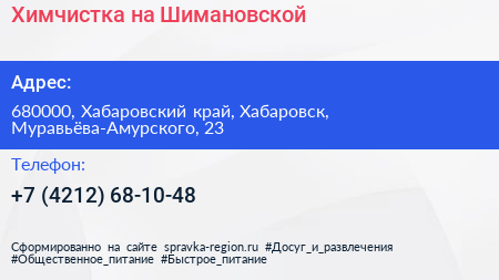 Химчистка на Шимановской по адресу 680000, Хабаровский край, Хабаровск, Муравьёва-Амурского, 23 в дальнейшем Организация, размещена в следующих категориях: