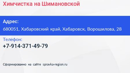 Химчистка на Шимановской по адресу 680051, Хабаровский край, Хабаровск, Ворошилова, 28 в дальнейшем Организация, размещена в следующих категориях: