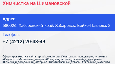 Химчистка на Шимановской по адресу 680026, Хабаровский край, Хабаровск, Бойко-Павлова, 2 в дальнейшем Организация, размещена в следующих категориях: