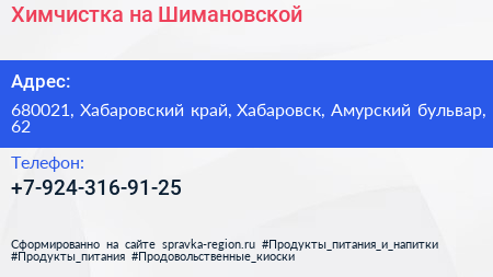 Химчистка на Шимановской по адресу 680021, Хабаровский край, Хабаровск, Амурский бульвар, 62 в дальнейшем Организация, размещена в следующих категориях: