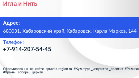 Игла и Нить по адресу 680031, Хабаровский край, Хабаровск, Карла Маркса, 144 в дальнейшем Организация, размещена в следующих категориях: