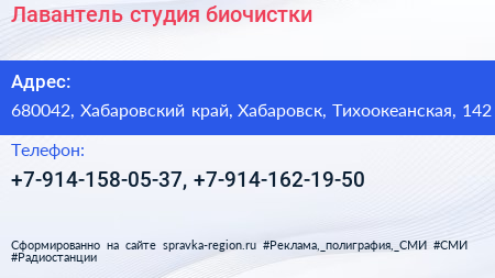 Лавантель, студия биочистки по адресу 680042, Хабаровский край, Хабаровск, Тихоокеанская, 142 в дальнейшем Организация, размещена в следующих категориях:
