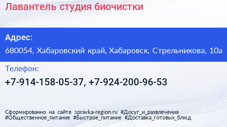 Лавантель, студия биочистки по адресу 680054, Хабаровский край, Хабаровск, Стрельникова, 10а в дальнейшем Организация, размещена в следующих категориях:
