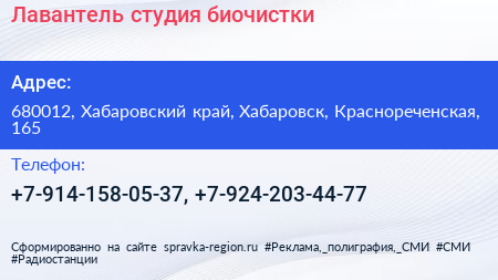 Лавантель, студия биочистки по адресу 680012, Хабаровский край, Хабаровск, Краснореченская, 165 в дальнейшем Организация, размещена в следующих категориях: