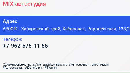 MIX, автостудия по адресу 680042, Хабаровский край, Хабаровск, Воронежская, 138/2 в дальнейшем Организация, размещена в следующих категориях: