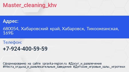 Master_cleaning_khv по адресу 680054, Хабаровский край, Хабаровск, Тихоокеанская, 169Б в дальнейшем Организация, размещена в следующих категориях: