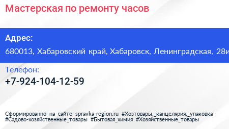 Мастерская по ремонту часов по адресу 680013, Хабаровский край, Хабаровск, Ленинградская, 28и в дальнейшем Организация, размещена в следующих категориях: