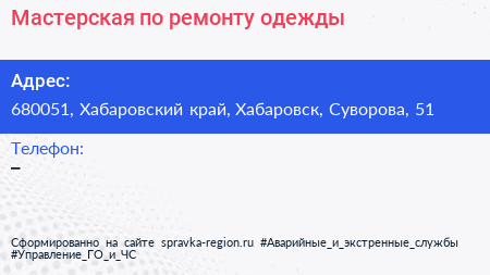 Мастерская по ремонту одежды по адресу 680051, Хабаровский край, Хабаровск, Суворова, 51 в дальнейшем Организация, размещена в следующих категориях: