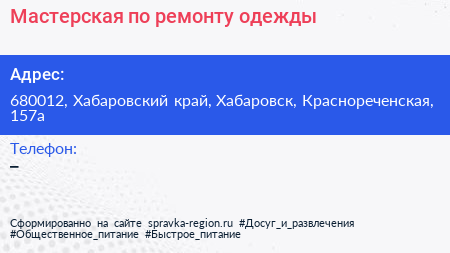 Мастерская по ремонту одежды по адресу 680012, Хабаровский край, Хабаровск, Краснореченская, 157а в дальнейшем Организация, размещена в следующих категориях: